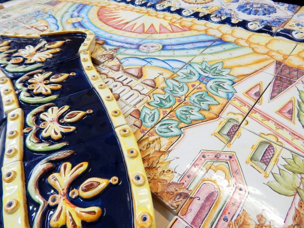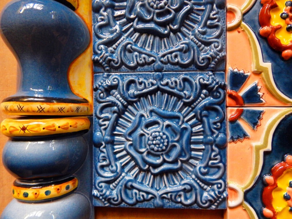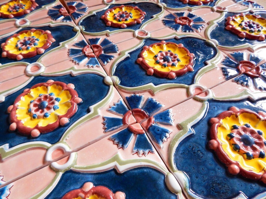 Очень симпатично смотрится полоса из изразцовых плиток с орнаментом, разграничивающая два живописных панно.