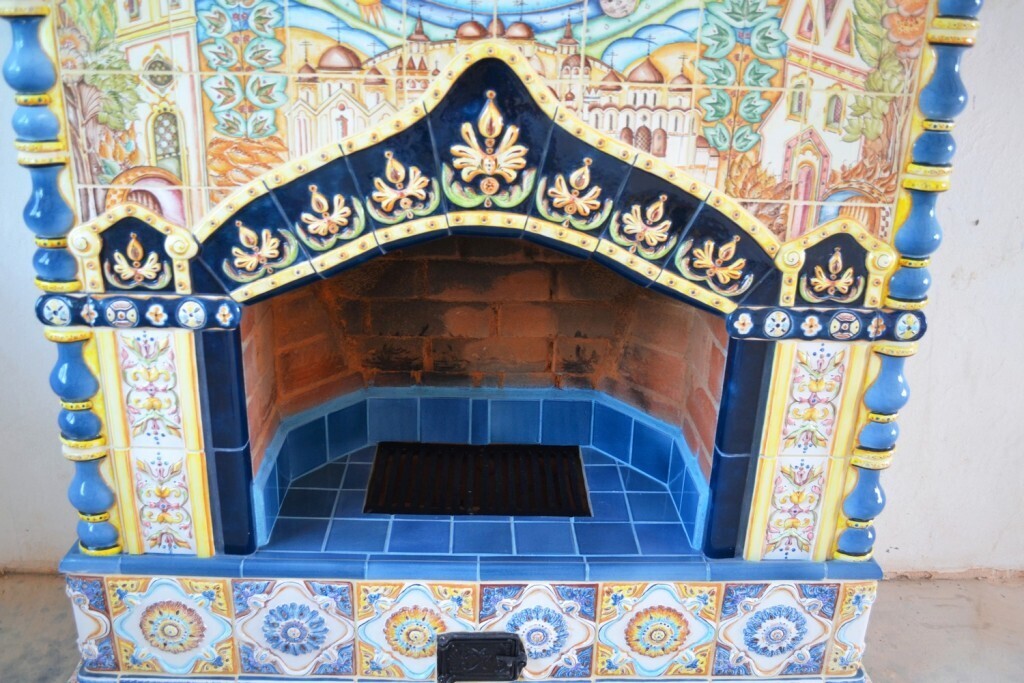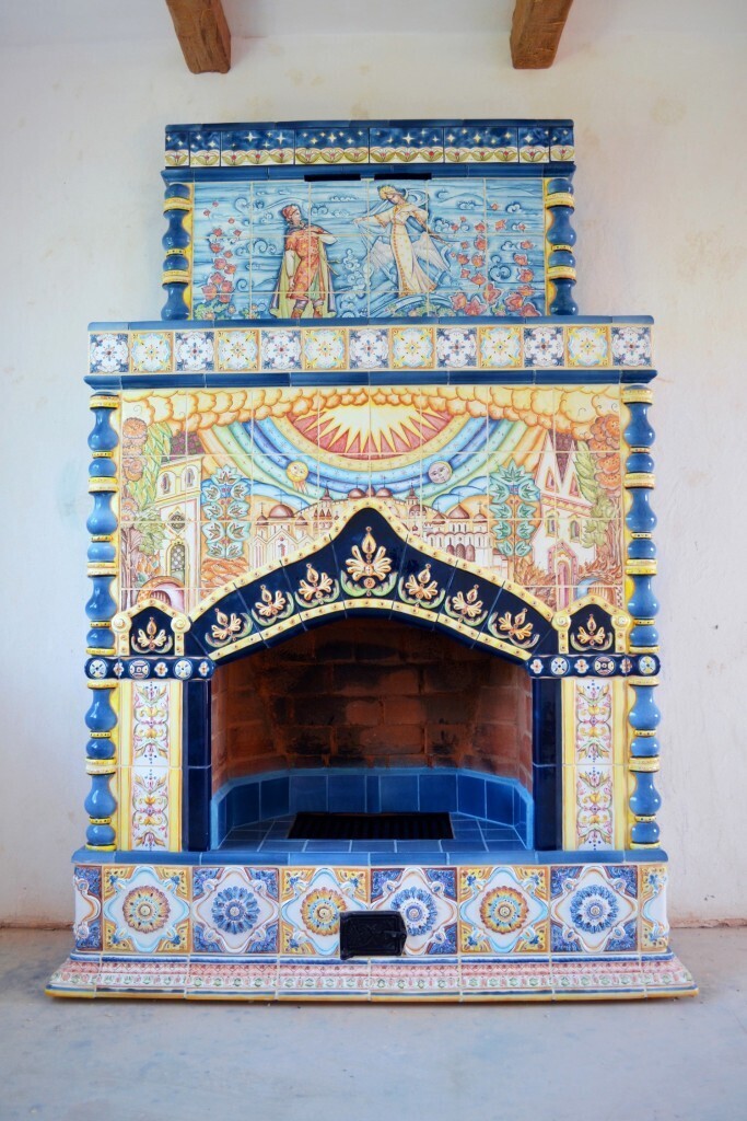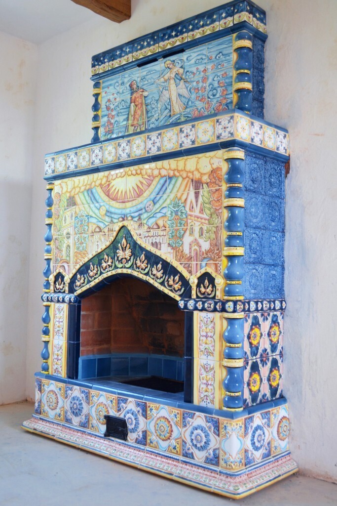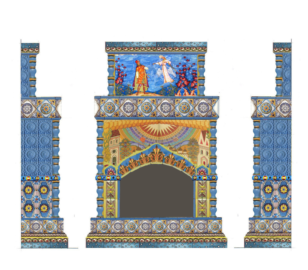 Панно над топкой скопировано нами с эскиза И. Я. Билибина. Чуть ниже — эффектный лепной элемент, имитирующий кокошник. Внутренняя часть топки частично отделана гладкими однотонными плитками.