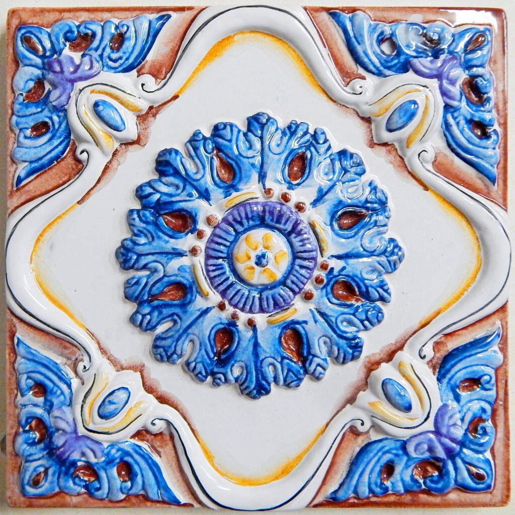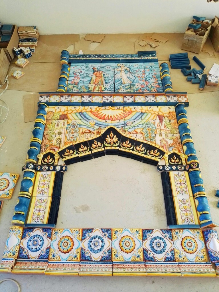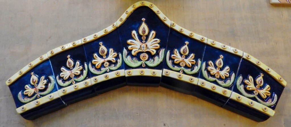Боковые части камина облицованы рельефными изразцами нескольких серий, а нижний ряд декорирован «Ажурными» рельефами и карнизами «Чешуйка» с росписью в тон основным цветовым акцентам.