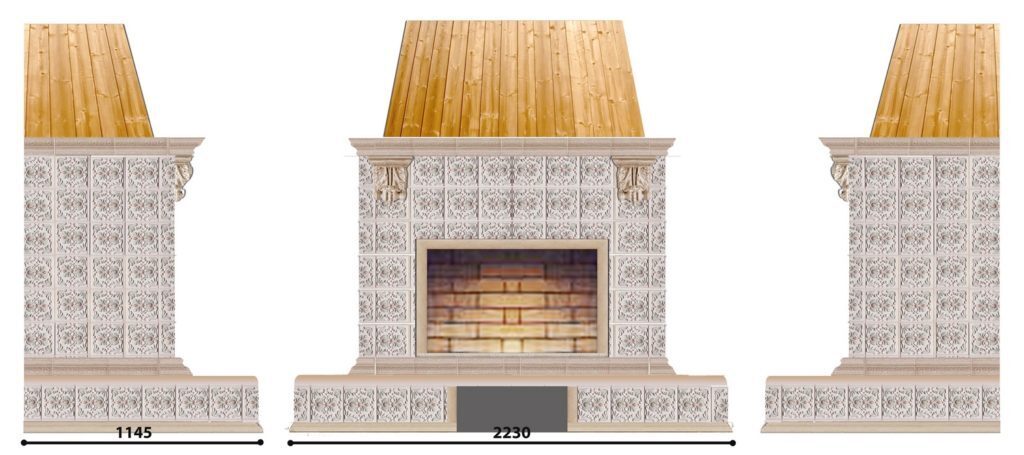 Заказчик из г. Алма-Аты, Казахстан, хотел облицевать свой камин в деревянном доме по аналогу нашего «Зимнего». Этот камин его устраивал всем, только от бокового дровника решил отказаться, а вместо «купола» над верхней полочкой выполнить отделку деревом.