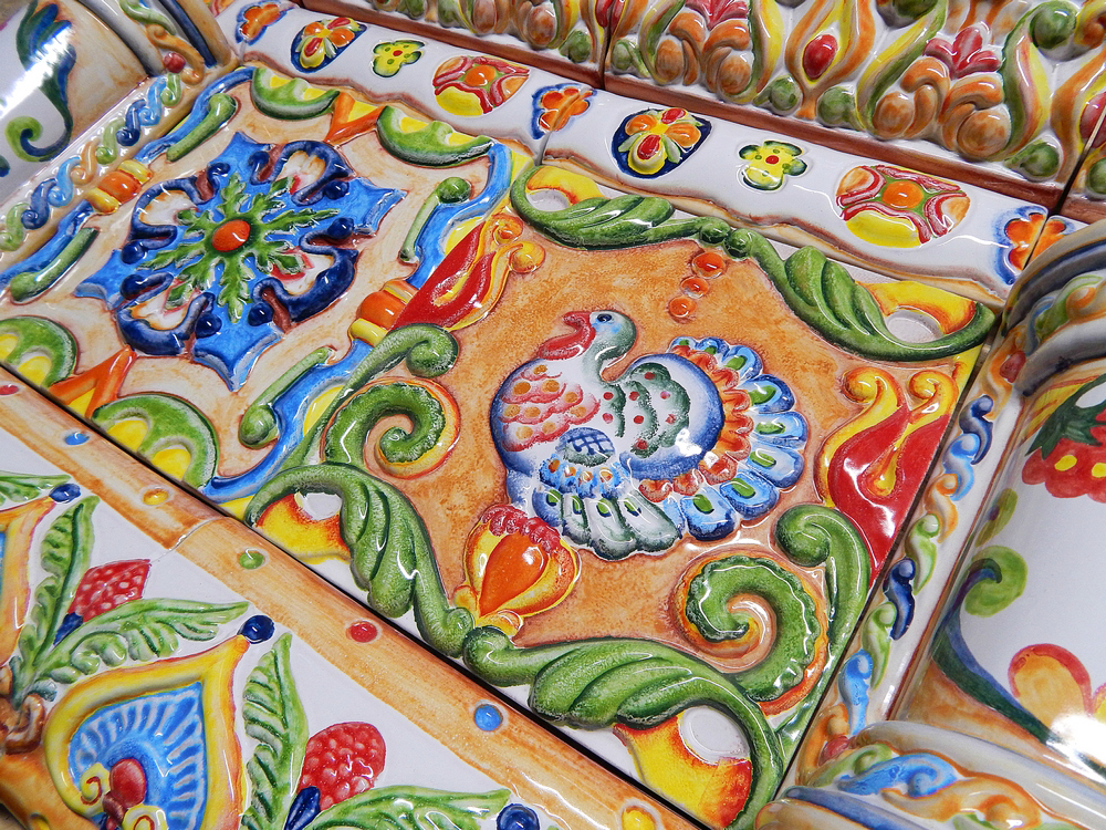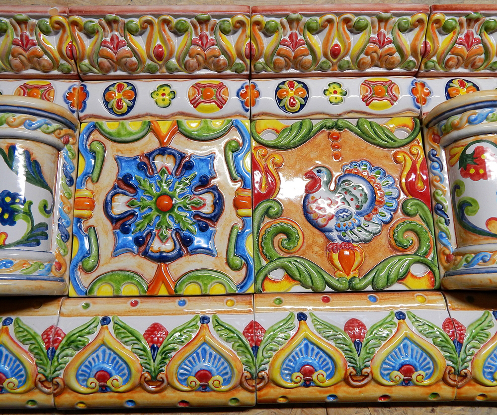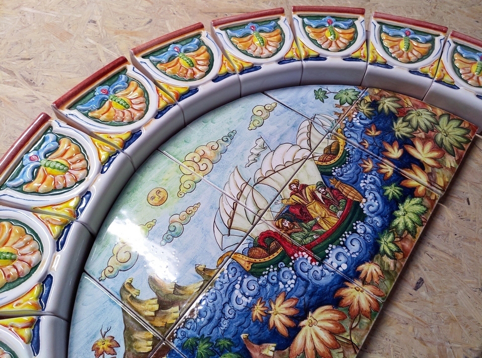 Далее стройная «резьба» керамических колонн оформила боковые части дымохода и подвела нас к вершине терема — браному поясу карнизов и бордюров. Навершие украшено ещё одним панно в палехском стиле и дополнено рельефным арочным сводом. Труба камина тоже частично облицована изразцами.