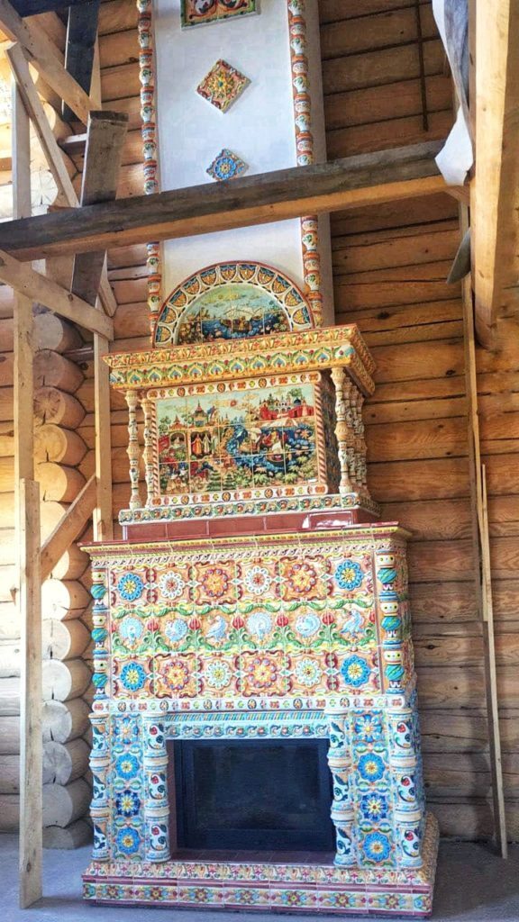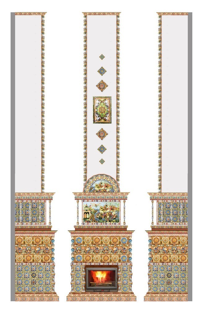 - Облицовка камина изразцами, оштукатуривание и покраска дымохода + декорирование изразцами.