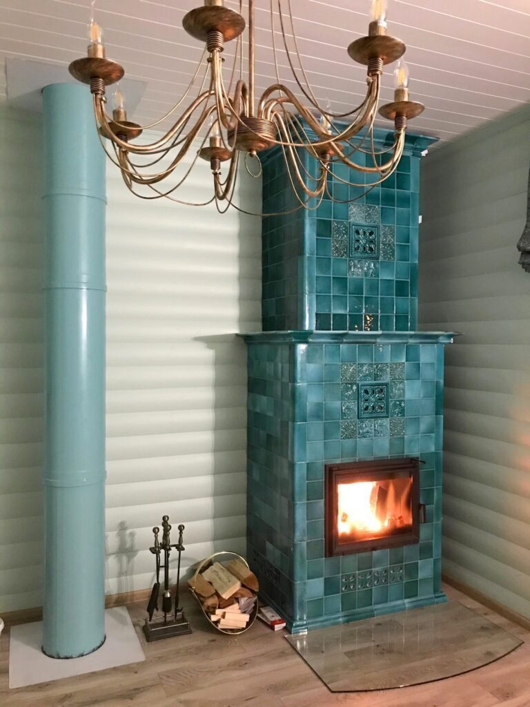 На дымоходе и в области над топкой сделаны небольшие рельефные акценты из «Суздальской» плитки со сказочными персонажами и цветочным орнаментом. Хоть они и не относятся к морским обитателям, общую картину спокойной и безбрежной морской глади насыщают.