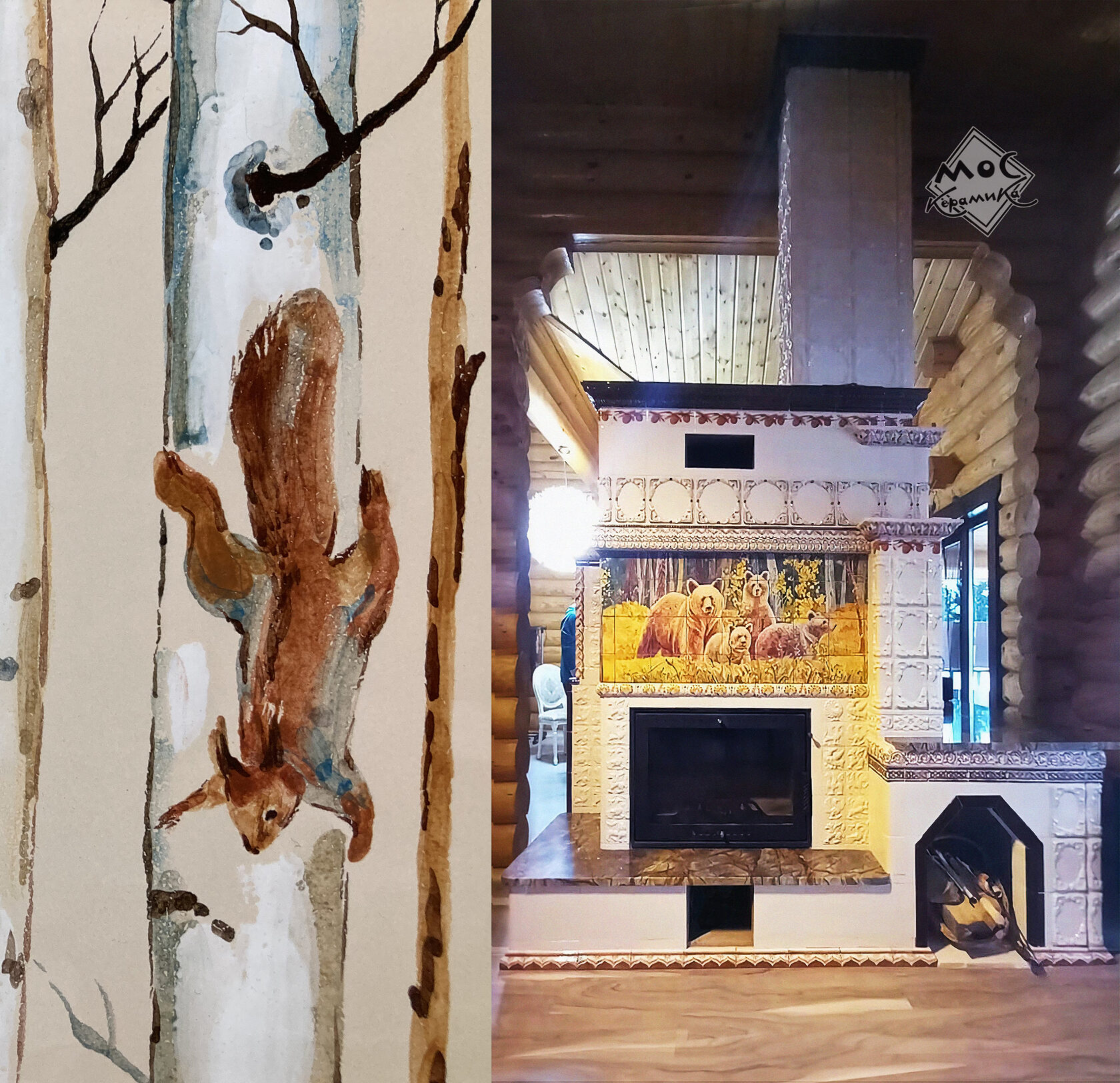 Эта четырехсторонняя печь наполнена истинно русским духом! Её стороны несимметричны, с каждой печь выглядит по-новому. Расписные панно запечатлели обитателей наших лесов - семейство медведей, оленя, глухаря, белочку и синичек. Поясок из шишек художники лепили вручную.