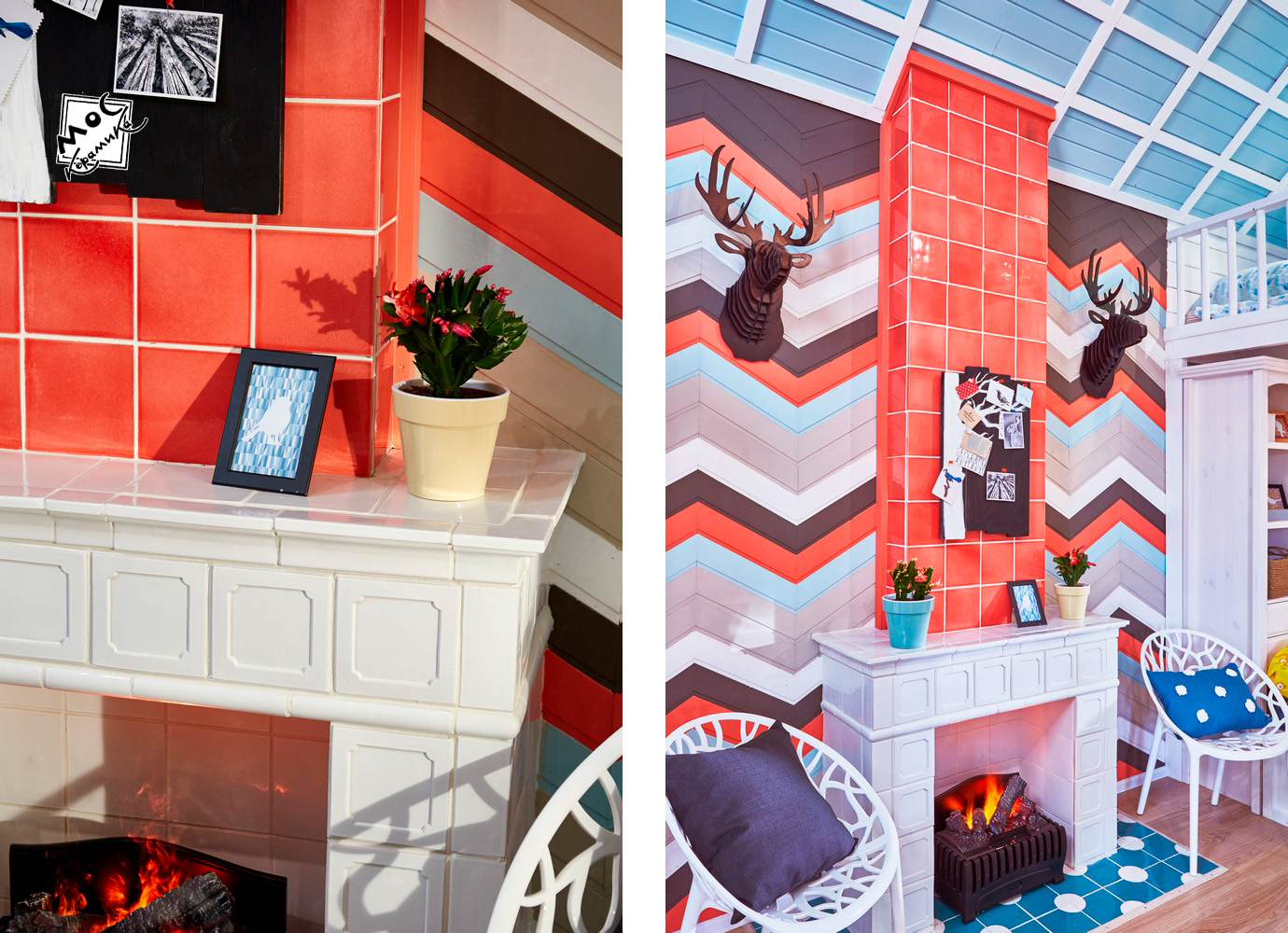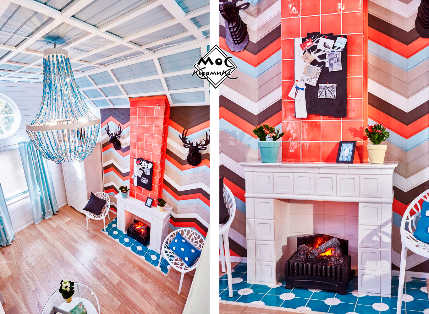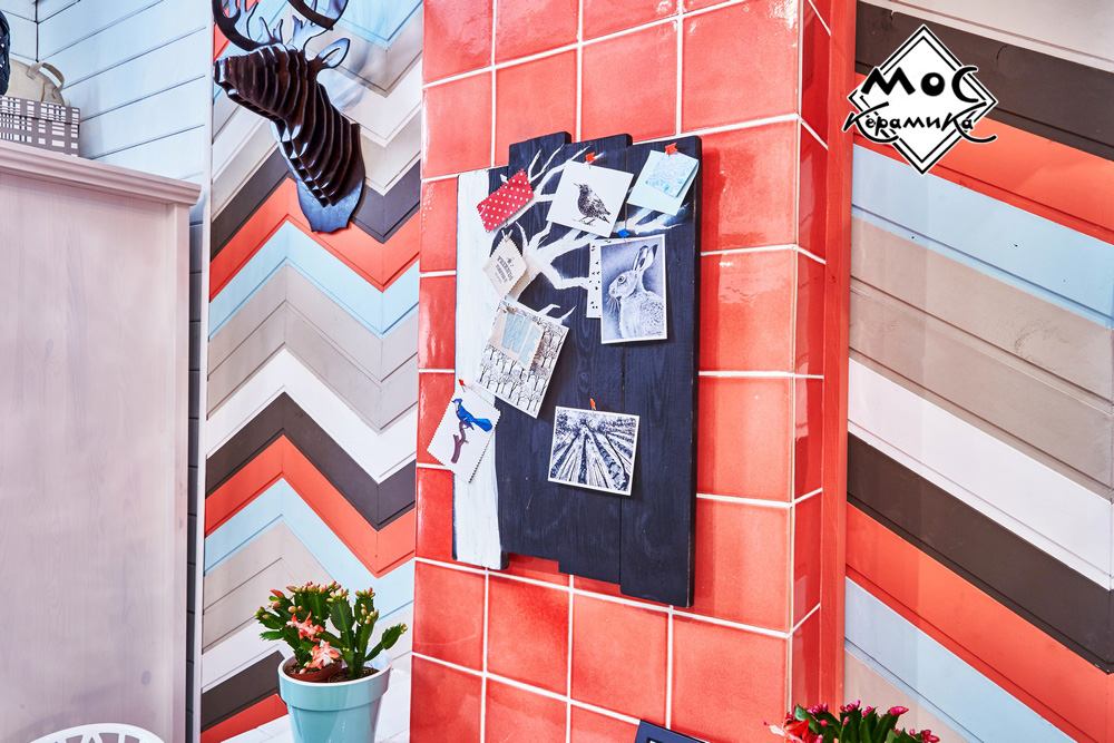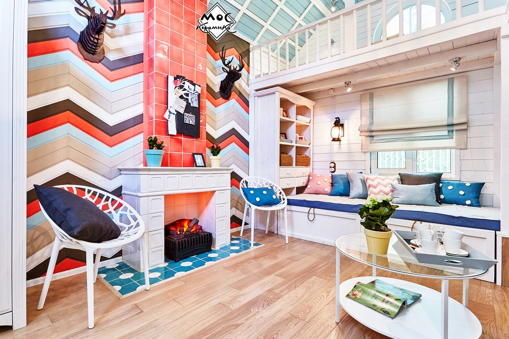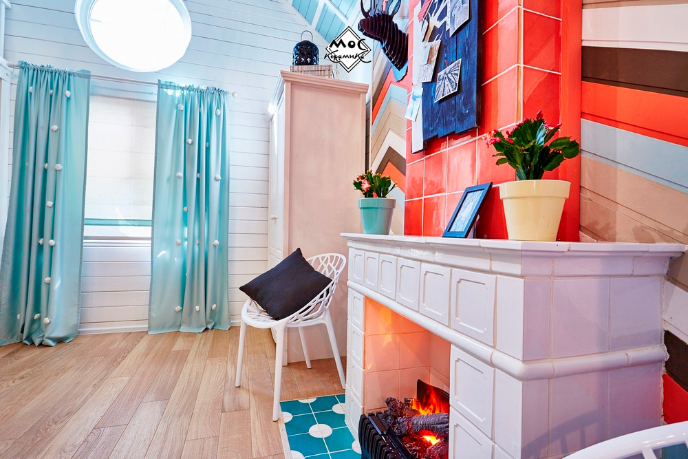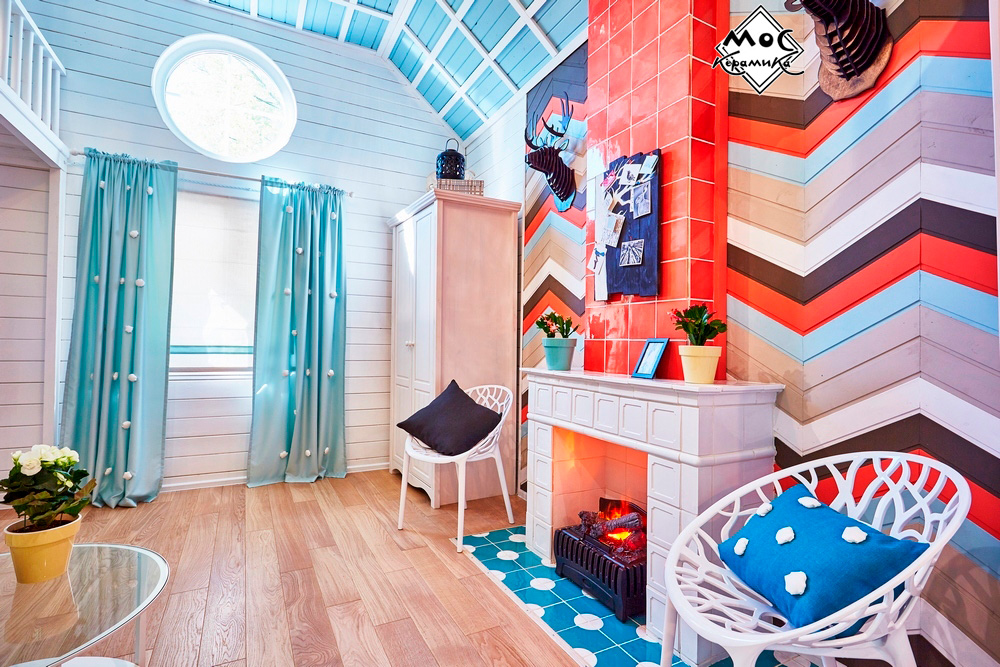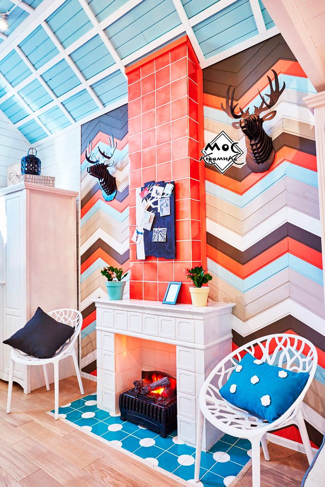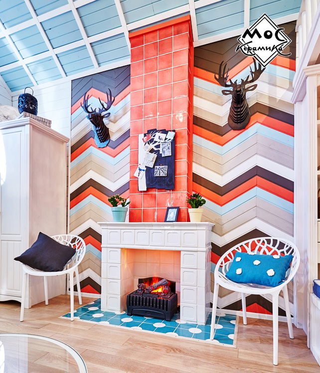 Центральная стена в этом проекте оформлена деревянными плашками, предварительно покрашенными в яркие цвета. Они прибиты под углом в виде зигзагов. Дымоход оформлен ярко-коралловыми изразцами, сочетание цветов плитки и дерева прекрасно подобрано и выглядит единой композицией.