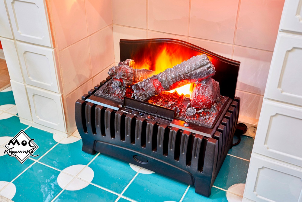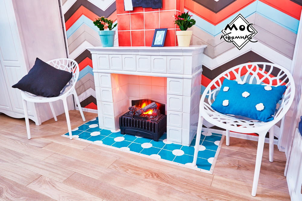 Портал камина оформлен элегантными белоснежными изразцами ручной работы. Дымоход – изразцами ярко-кораллового цвета.