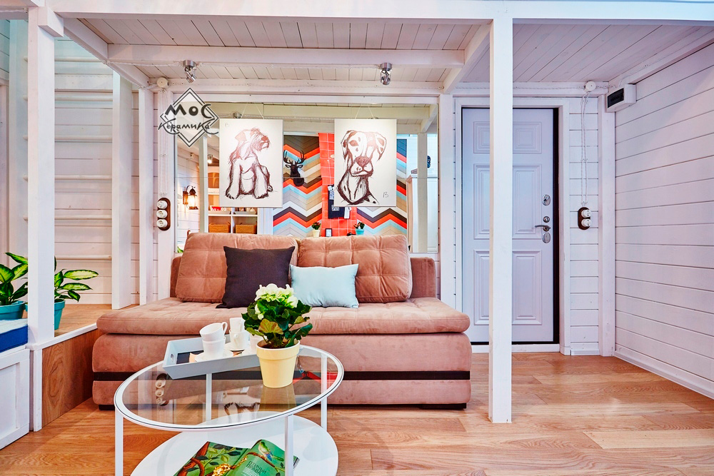 Фазенде это удалось. Комната превратилась в многофункциональное помещение, где есть антресоли для сна и отдыха детей, очаг с изразцами – для уюта, общая столовая, спальное место для родителей, даже подиум для посиделок с гостями. И всё это на 25 квадратах!