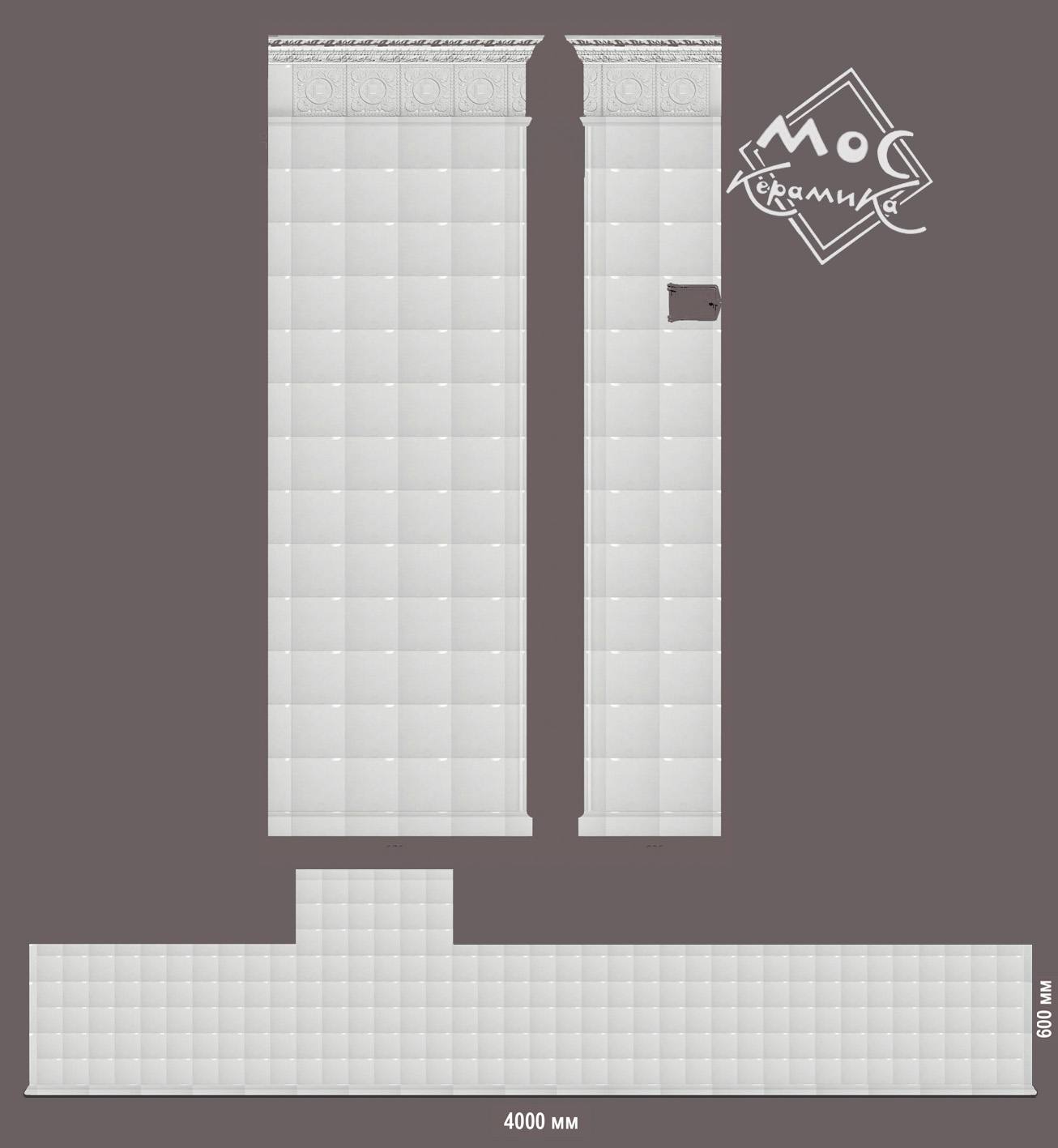 В проекте были использованы гладкие фоновые изразцы 203х203мм, изразцы Ракушка, Карниз Людовик.