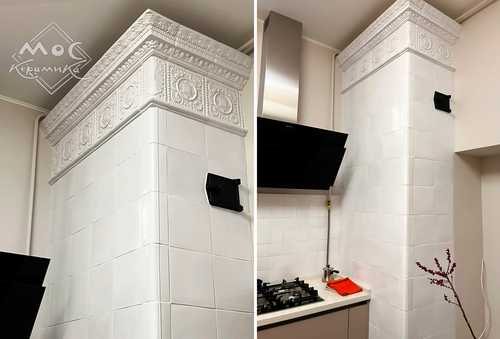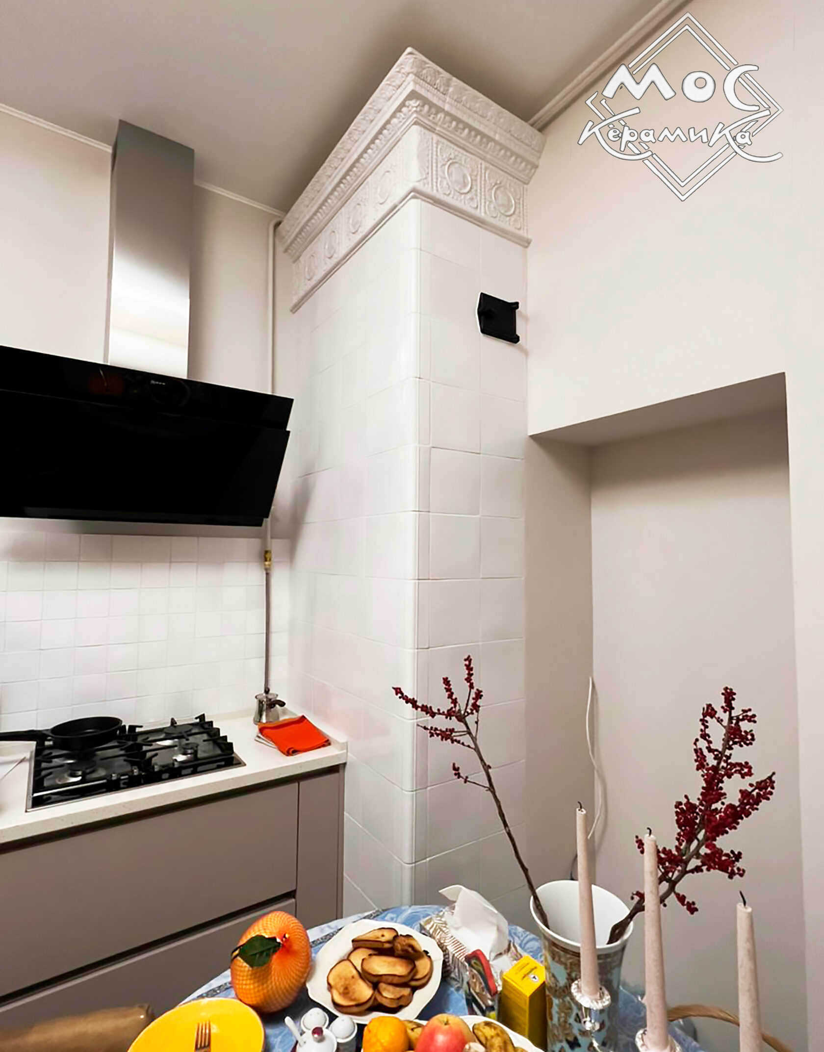 В нашей истории реставрацией старинного объекта занималась заказчица в своей квартире. Изразцов на печи не было, так что демонтаж проводить не пришлось, приглашенный печник привел старую конструкцию в рабочее состояние, положил изразцовую облицовку в традиционном для таких объектов стиле и спокойной цветовой гамме, а также продолжил кухонный фартук по всей стене.