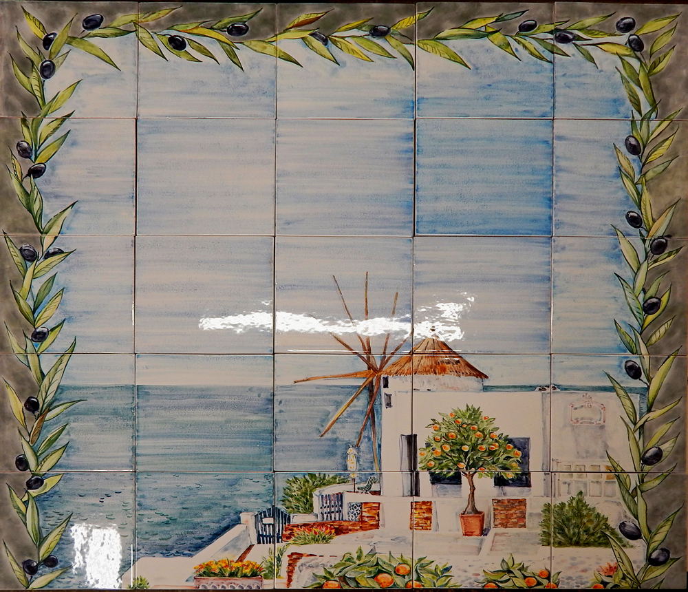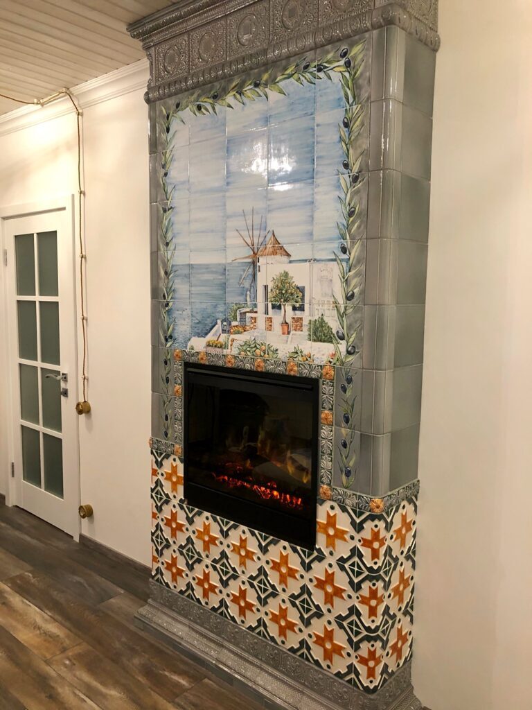 Главным элементом камина стало керамическое панно с греческим островом Санторини. Этот загадочный остров овеян множеством мифов и нередко именуется «затерянной Атлантидой», его визитной карточкой являются выкрашенные в белый цвет дома, расположенные прямо на вулканических скалах. Один из таких домиков в окружении неба, моря и сочной растительности мы изобразили на панно. Продолжила греческую нотку живописная рамка из оливковых ветвей.