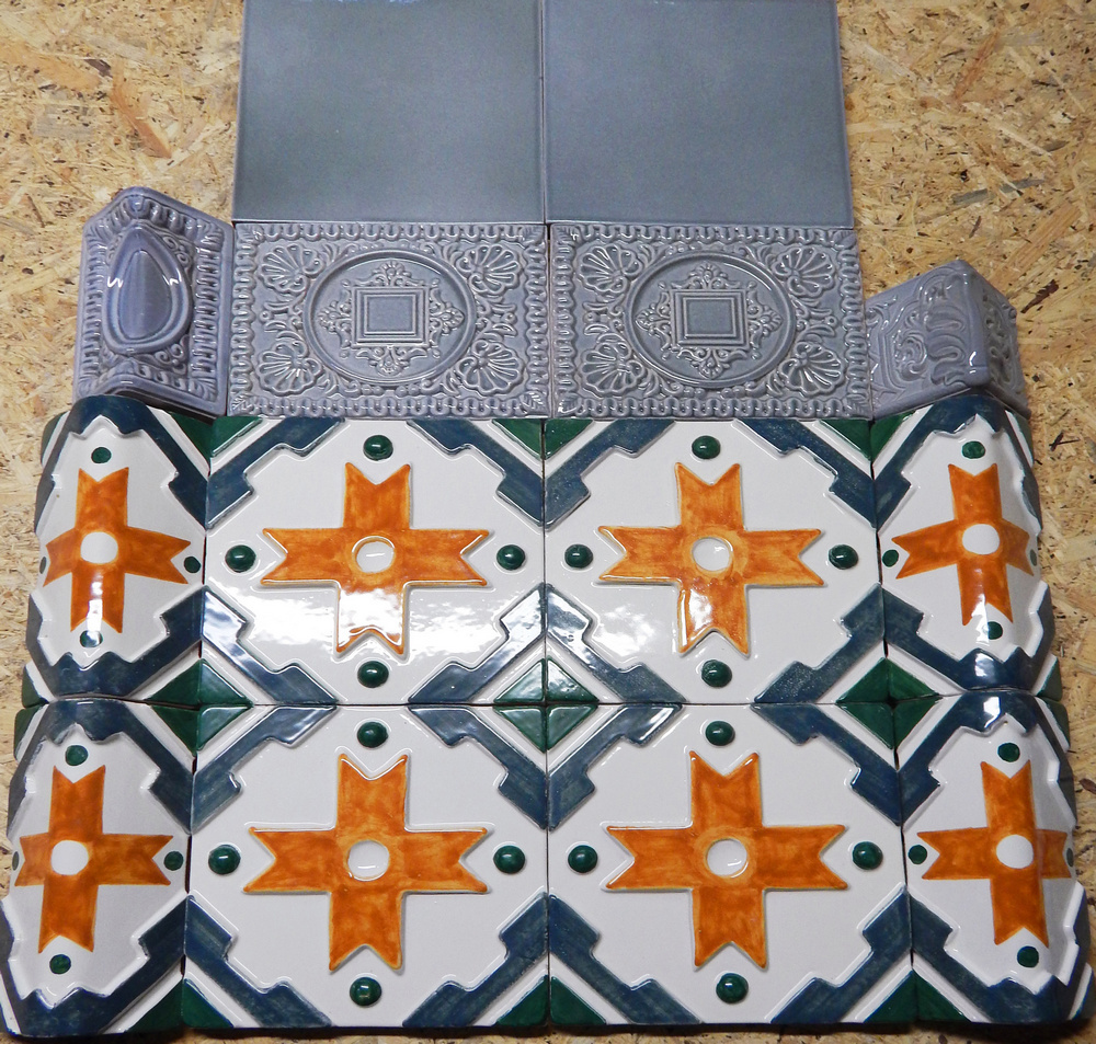 Живопись дополнена гладкими изразцовыми плитками, рельефными изразцами «Ракушка» и множеством дополнительных элементов. Область под топкой украшена расписными изразцами, скопированными со старинных эскизов студентов художественного училища имени Штиглица.