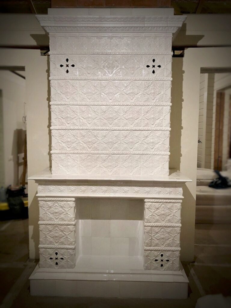 Изразцы для облицовки камина заказчик выбрал рельефные в стиле Ренессанс, каждый изразцовый ряд разграничен поясками бордюров с орнаментом. Рельефное узорочье разбавлено гладкими вставками на полке камина, в нижней части и в области топки.