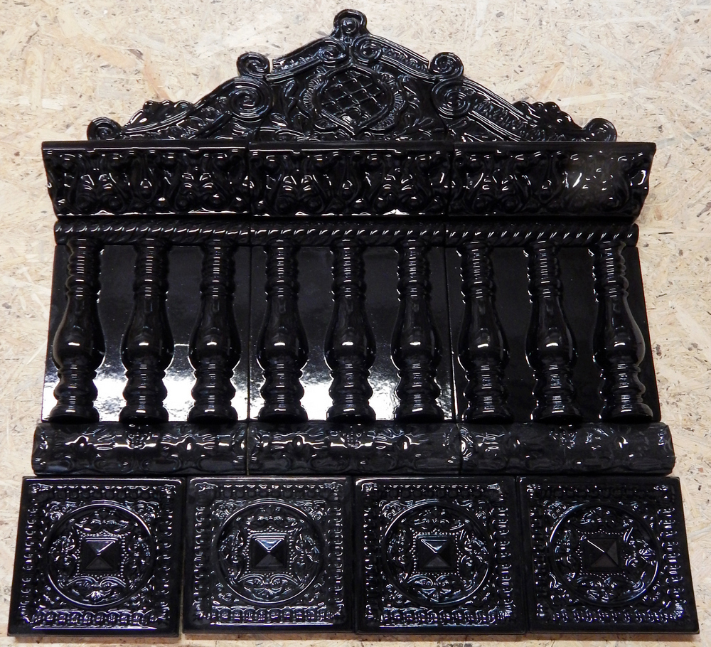 В облицовке топочной части камина задействованы гладкие изразцы, осторожно разбавленные рельефными вставками. Дымоход украшен стройной грядой колонн и «Львовских» рельефов, чередующихся с поперечными поясками. Рельефное навершие камина дополнено лепной короной.