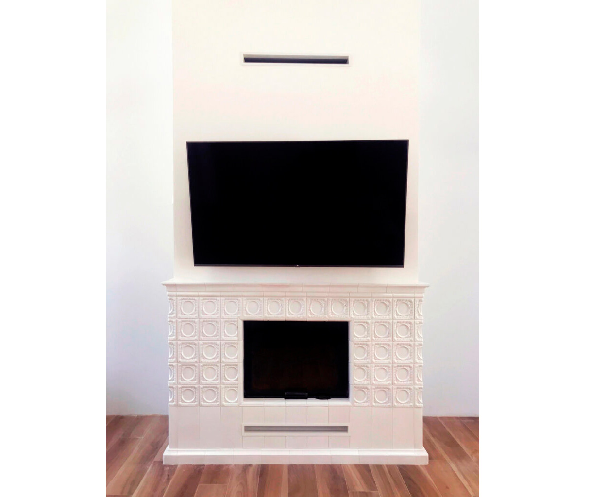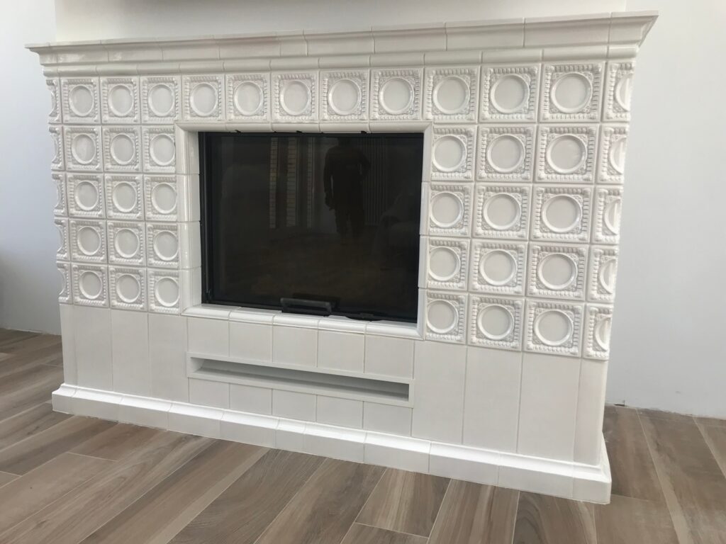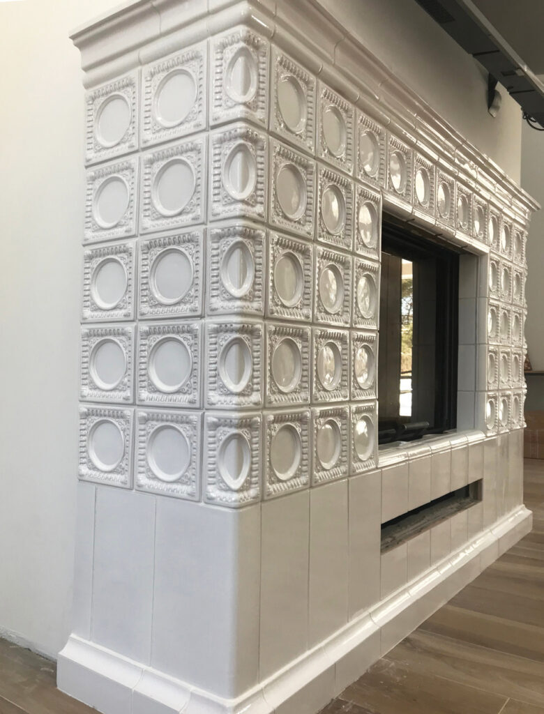 В облицовке этого камина мы задействовали «Львовские» рельефы и доборы классического белого цвета — материал стойкий и долговечный. Все отделочные элементы произведены нашими мастерами вручную из терракотовой глины без примесей. Изразцовая облицовка камина будет мягко отдавать тепло помещению и в дуэте с ТВ-устройством станет центром притяжения вашей семьи и гостей.