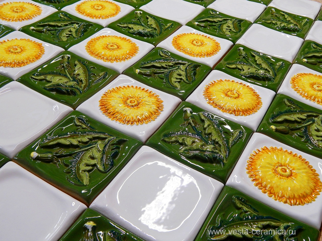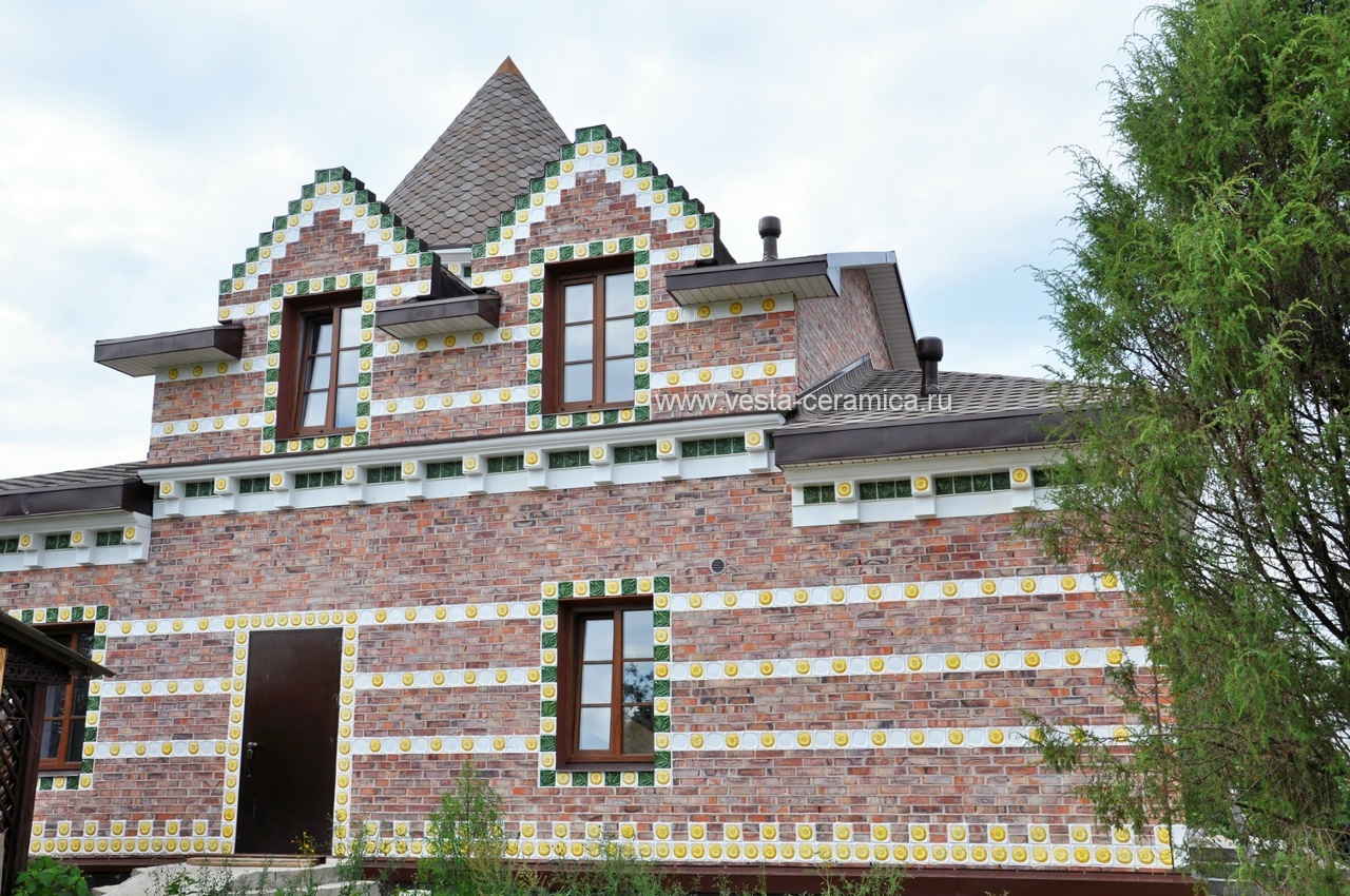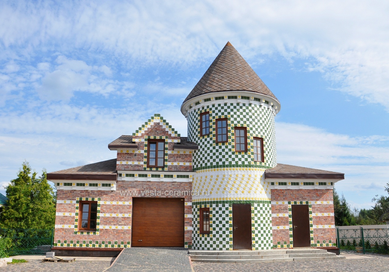 Дизайнер заказчика разработал проект дома по мотивам испанского особняка Эль Каприччо (автор – маэстро Антонио Гауди). А для его внешней отделки выбрал нашу рукотворную фасадную керамику. Фасад облицован цветным кирпичом, чередующимся с глянцевыми майоликовыми плитками. Только вместо легендарных подсолнухов – нежные одуванчики.