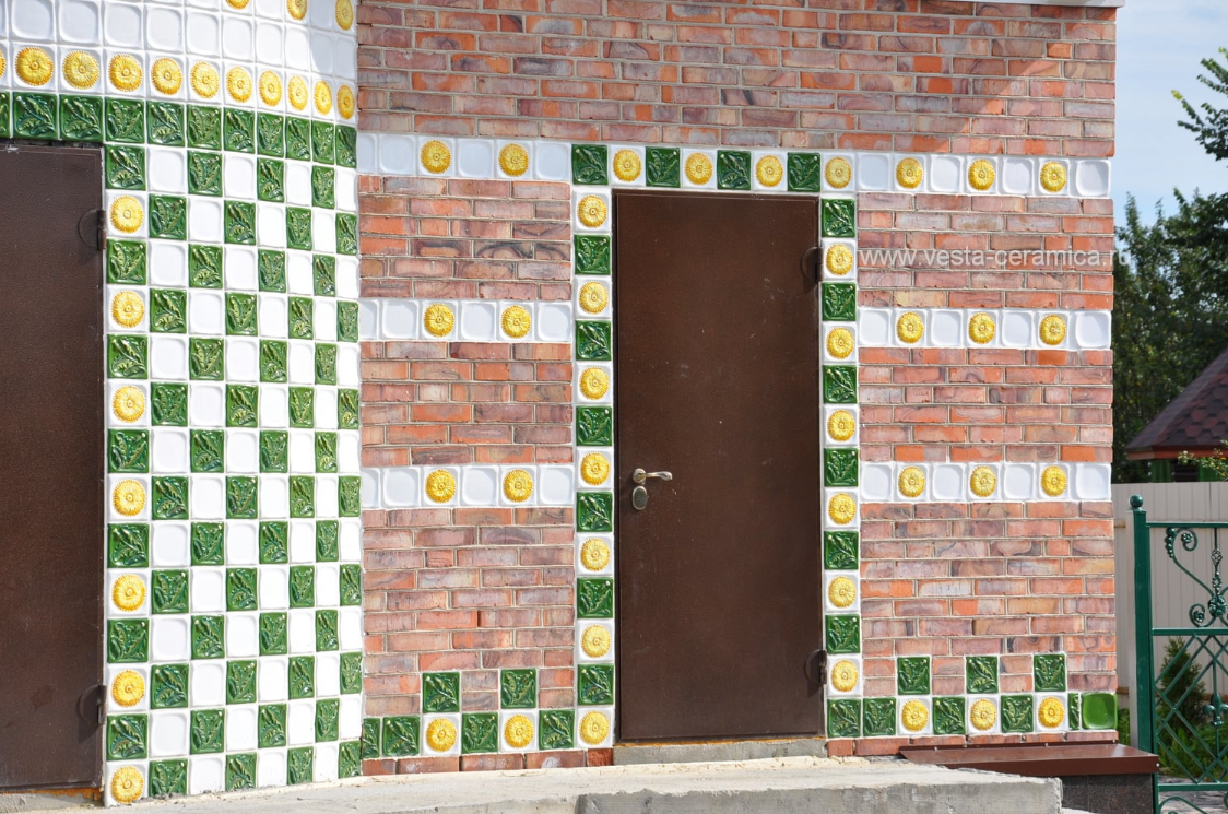 Цветная фасадная майолика – отделочный материал для стильной архитектуры. Оформление фасада при таком разнообразии ярких природных цветов выглядит органично и отлично сочетается с садовой зеленью.