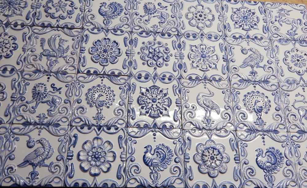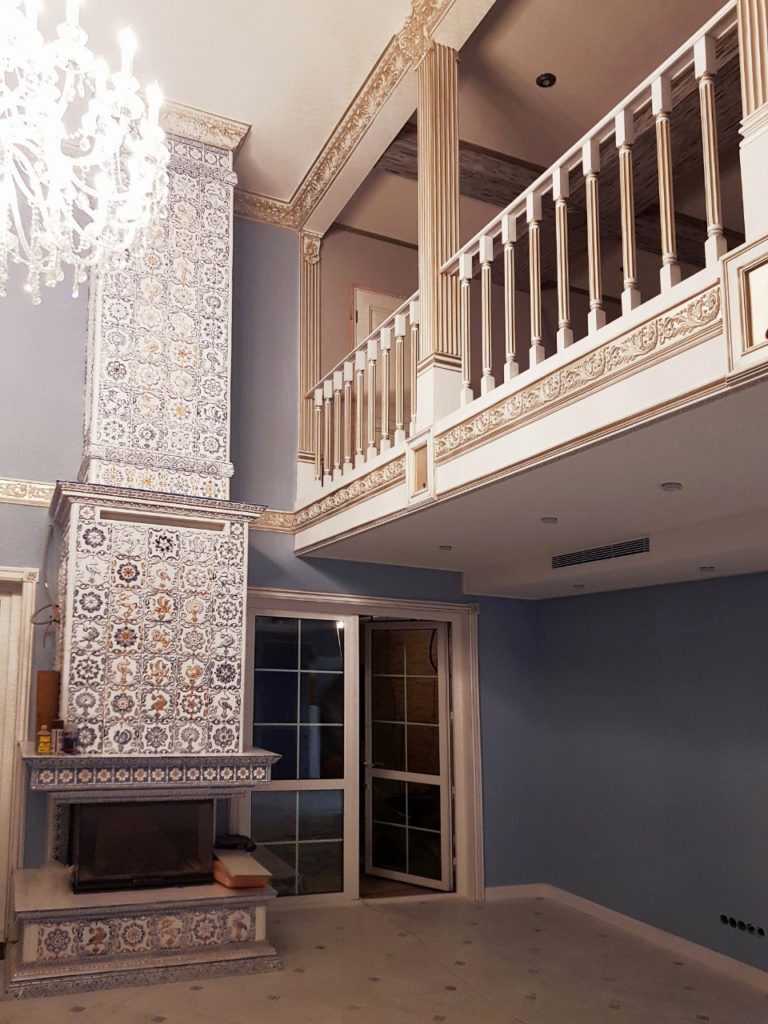 Тема традиционно русских изразцов с зооморфными сюжетами полностью раскрыта на высоком камине и дополнена цветочными вставками, разграниченными лёгкими «нитями» рельефных бордюров, карнизов и карандашей.